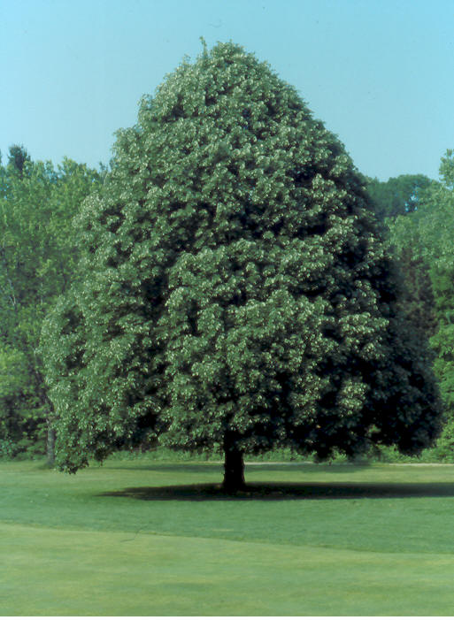Это листопадное дерево имеет высоту почти 20 метров и ширину до 10-12 м. В раннем возрасте форма его пирамидальна, а позже становится широкоовальной. Крона довольно густая; основная масса ветвей немного приподнята, а нижняя их часть свисает. Листья имеют сердцевидную или округлую форму, длину – до 7-10 см, яркую тёмно-зеленую раскраску на протяжении всего года. Также они довольно кожисты, выпуклы кверху и несколько корытообразны. Листья плотно покрывают побег, междоузлия маленькие.