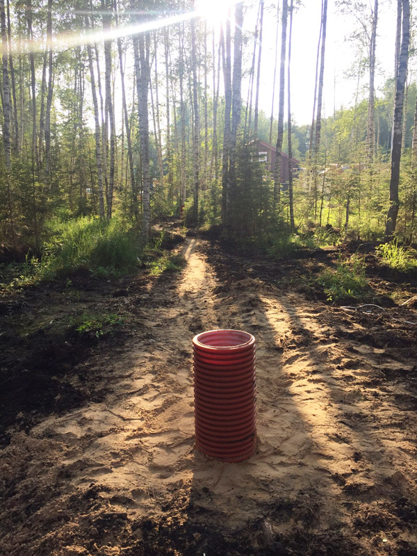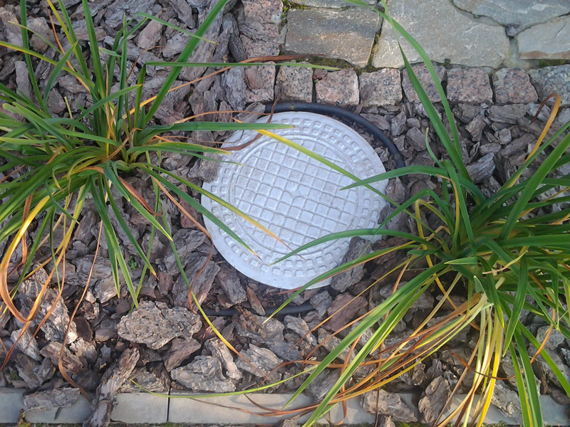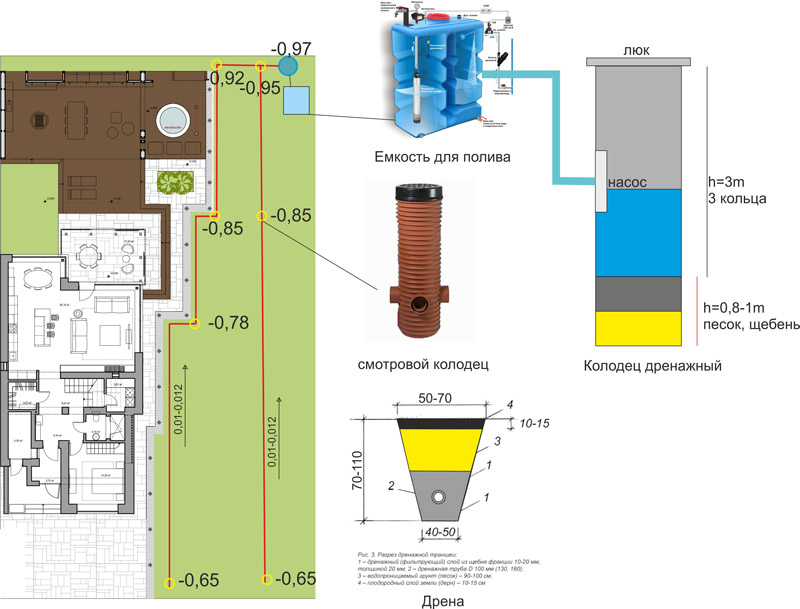 - Дренажные траншеи, расходящиеся веером или по произвольным векторам от дренажного колодца, установленного в самой низкой части участка. Колодец не должен быть герметичным, выполняется из пластика, бетона;