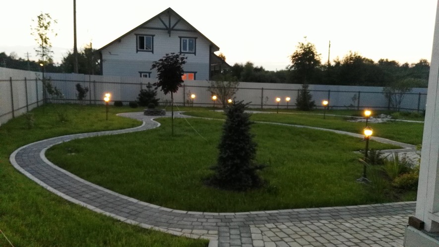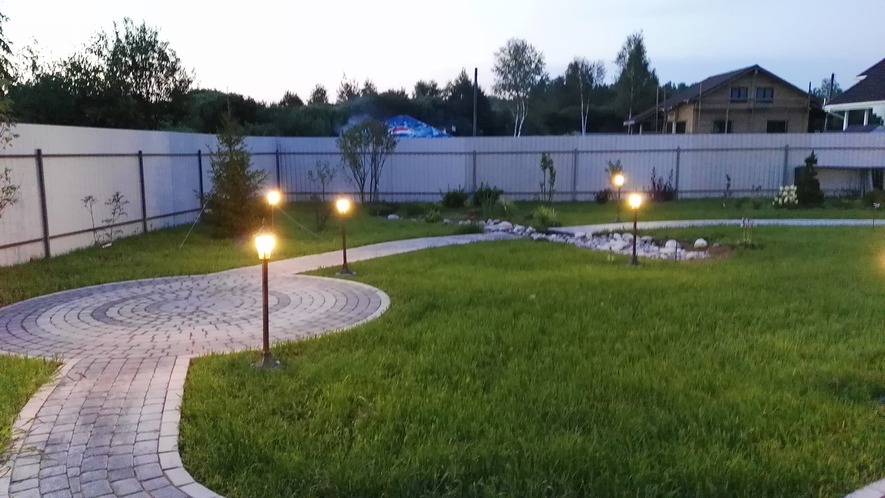 - Локальное освещение дорожек однотипными светильниками, установленными вдоль полотна. Они дают неяркий свет, достаточный для безопасного передвижения;