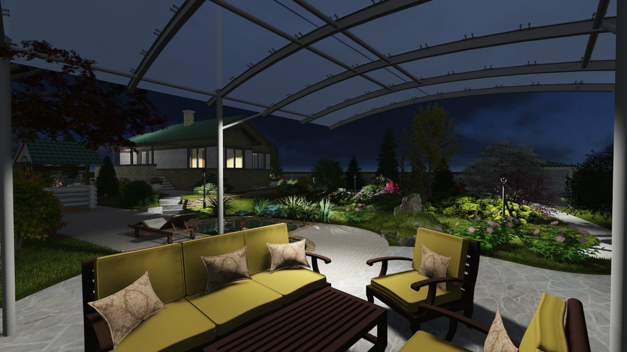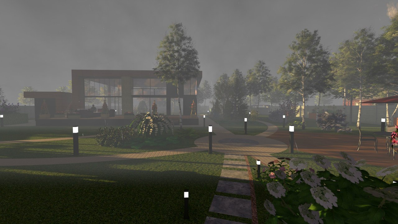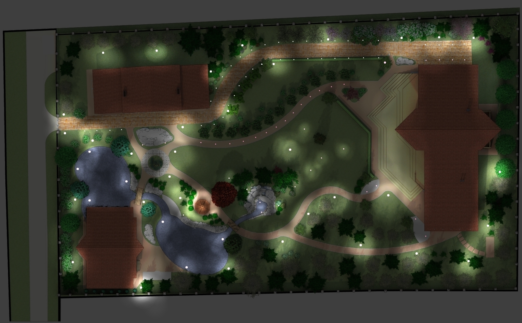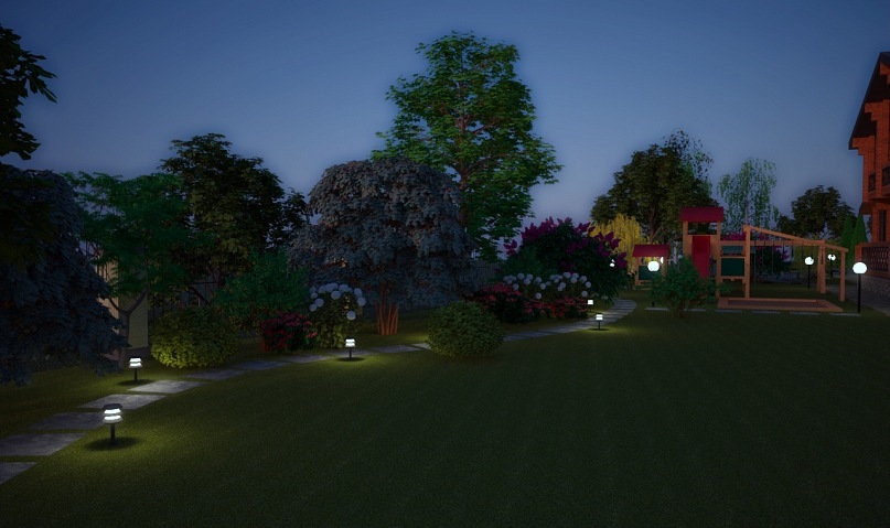 - Проектирование уличного освещения для дачи или сада. На этом этапе учитывается множество различных факторов: наличие деревьев и их высота, форма и светопоглощающие свойства их крон, длина, ширина дорожек, габариты МАФ, площадь газона, клумб, рабаток, водоема и других сооружений, требующих подсветки.