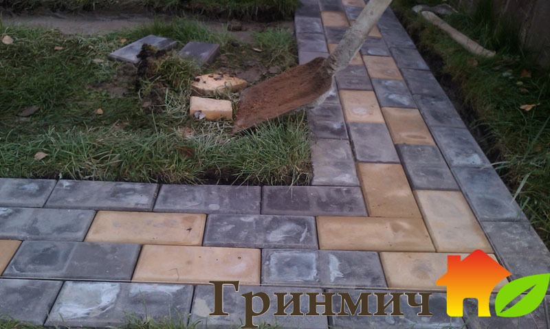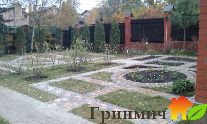 После копания траншей мы приступили к укладке плитки. Был использован двухцветный камень, что придает требуемый изыск и подчеркивает стиль дизайнера. Хорошо уложенная на правильно подготовленную основу плитка не прорастает, не проваливается и тем более не скашивается.