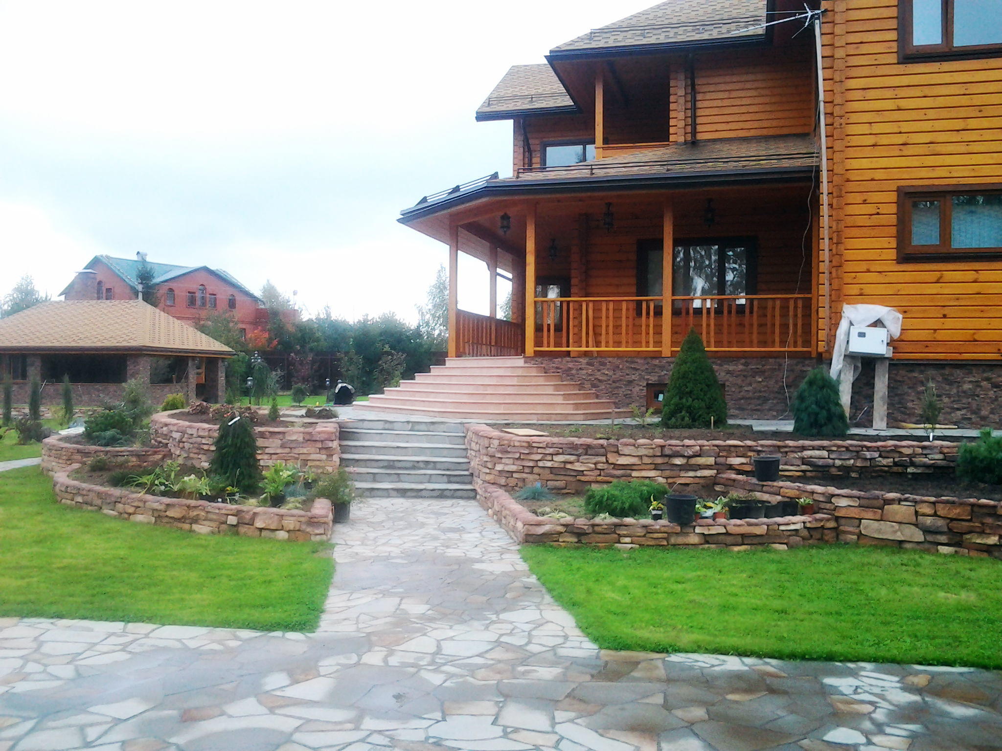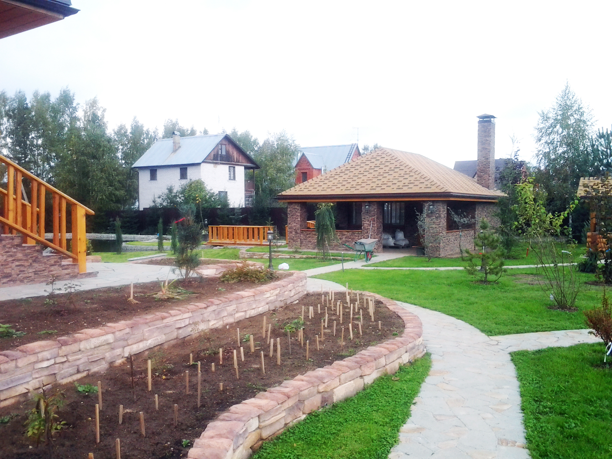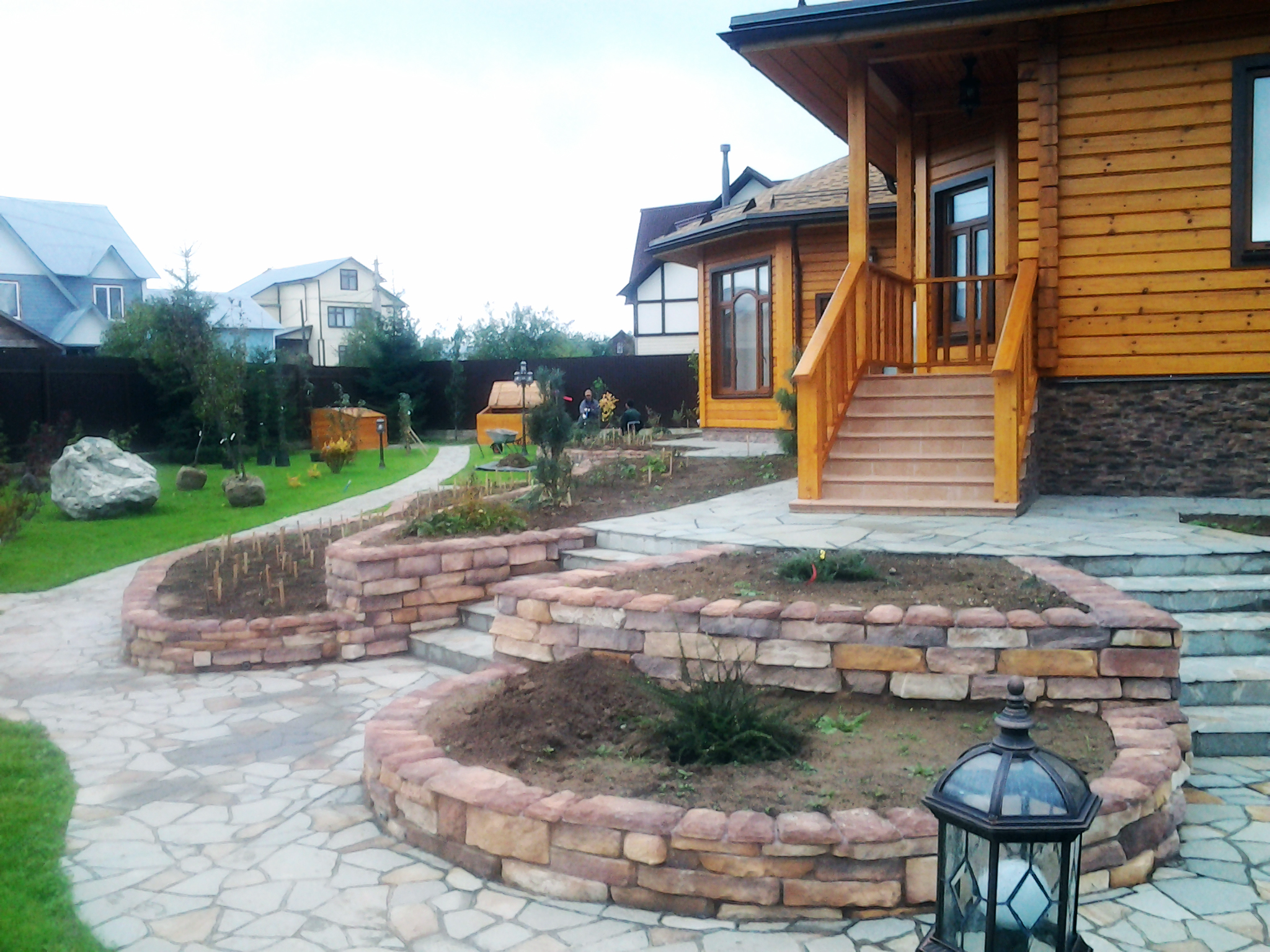 Если взглянуть на другую часть приусадебного участка, то там можно увидеть многоуровневые клумбы, обложенные искусственным камнем. Кстати, он здесь используется повсюду, что можно объяснить скорее недорогой стоимостью материала, но, конечно же, и разнообразием видов, расцветок и форм.