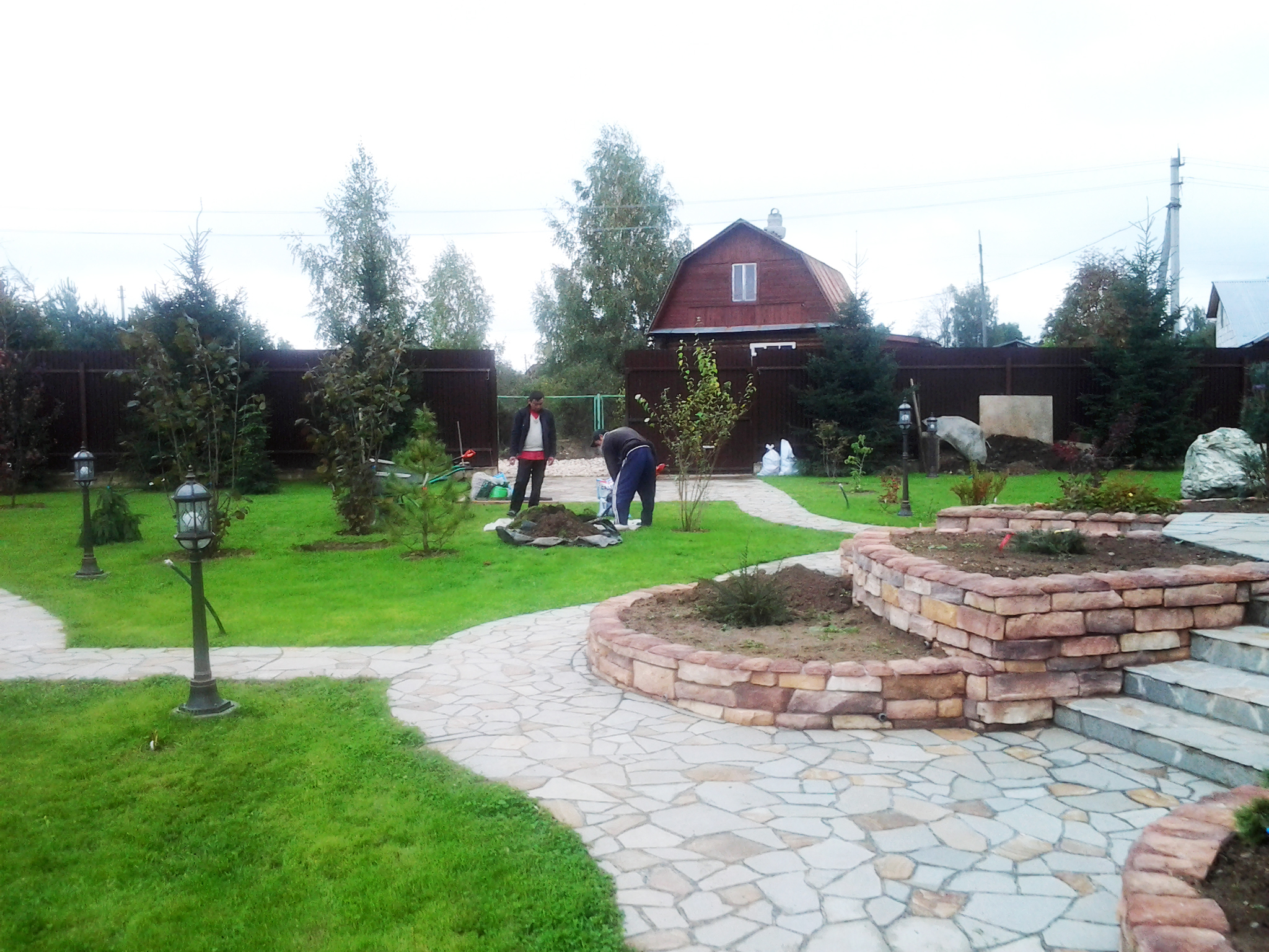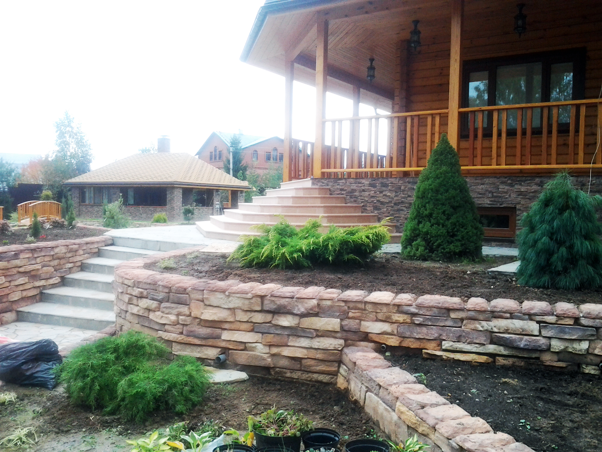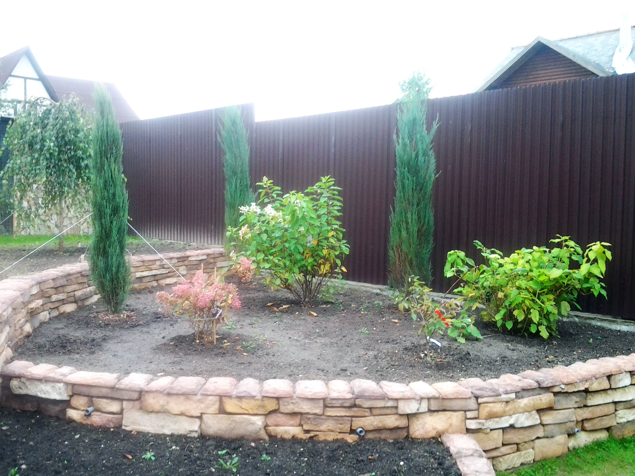 Если взглянуть на другую часть приусадебного участка, то там можно увидеть многоуровневые клумбы, обложенные искусственным камнем. Кстати, он здесь используется повсюду, что можно объяснить скорее недорогой стоимостью материала, но, конечно же, и разнообразием видов, расцветок и форм.