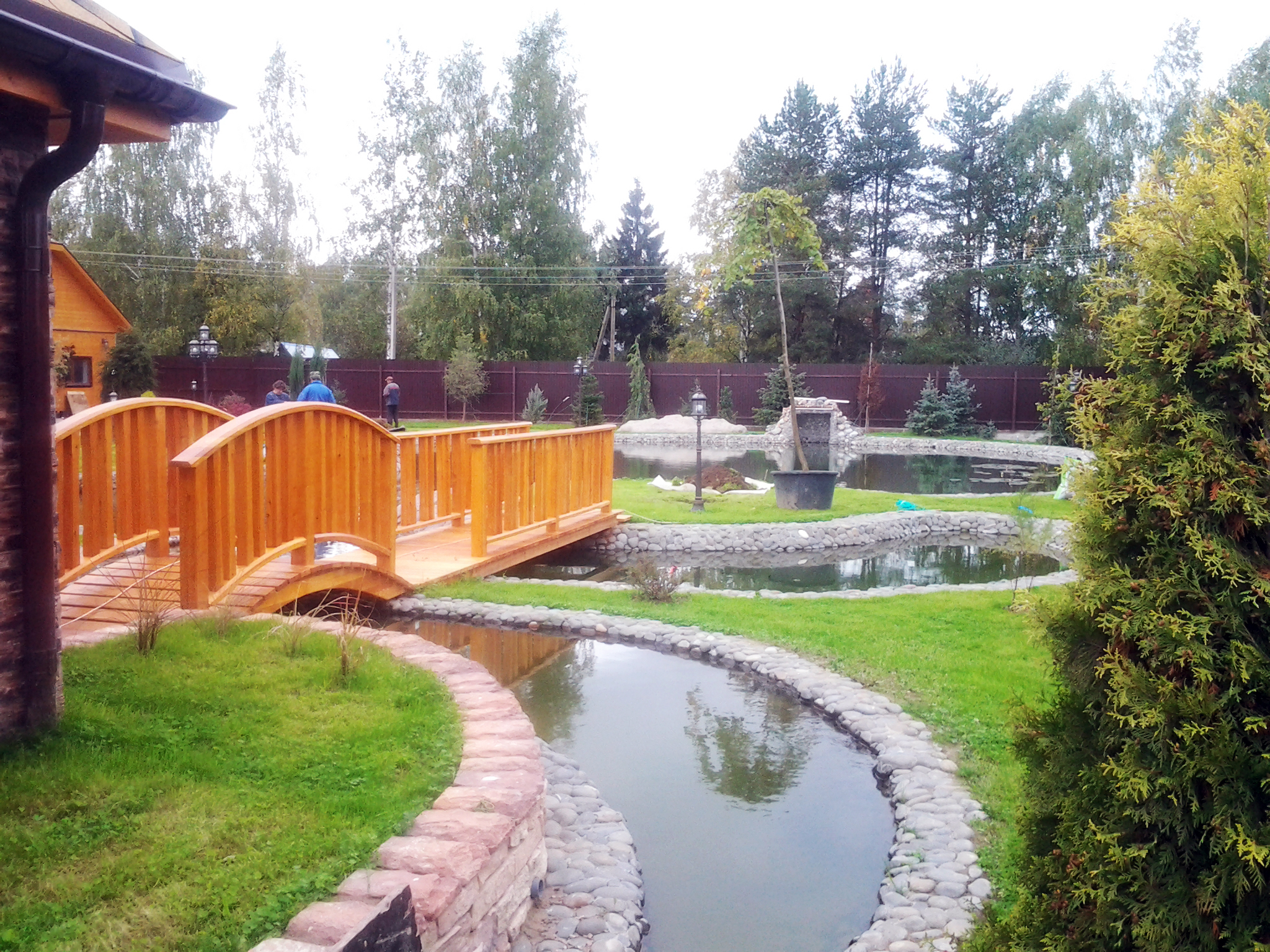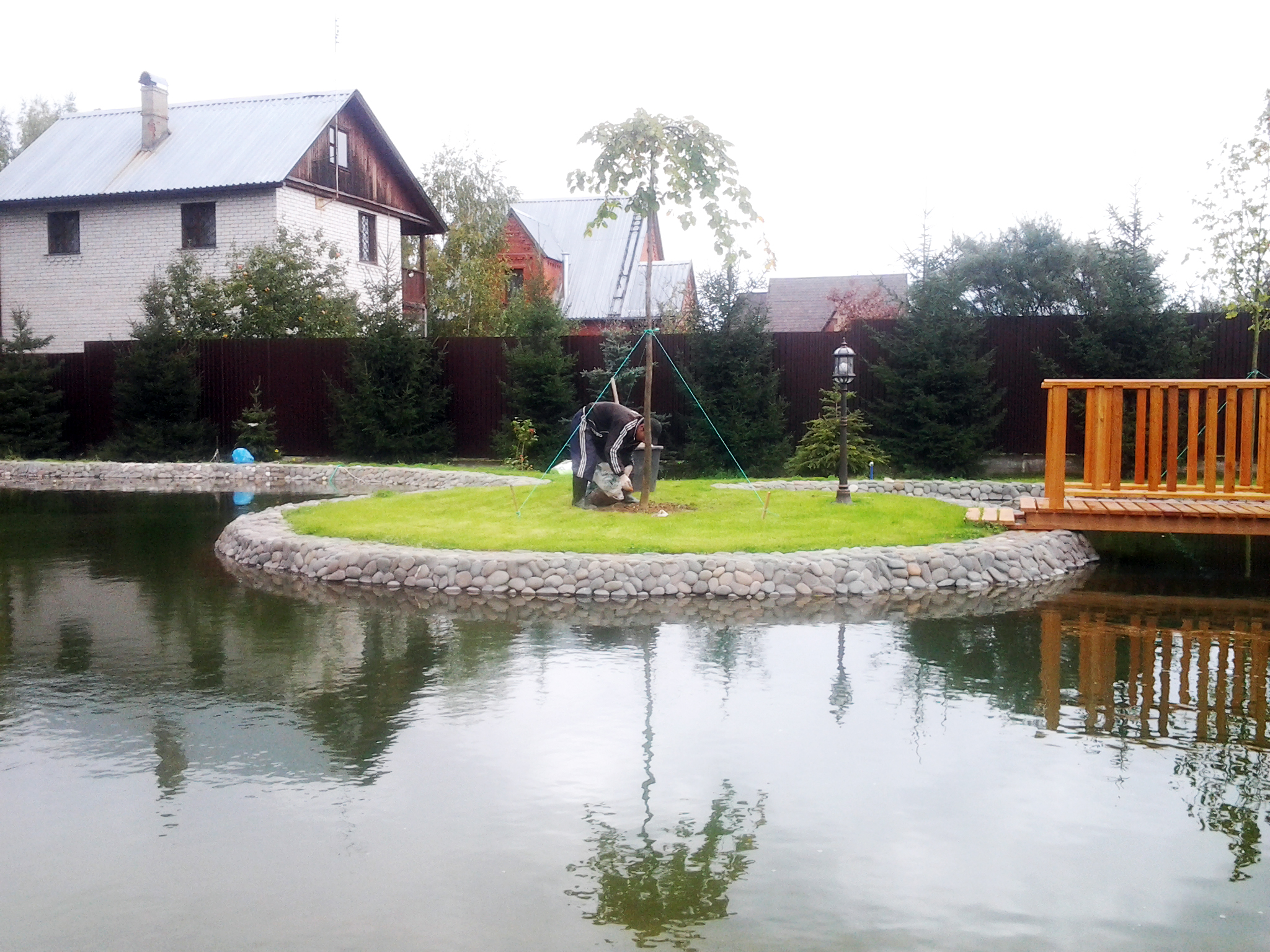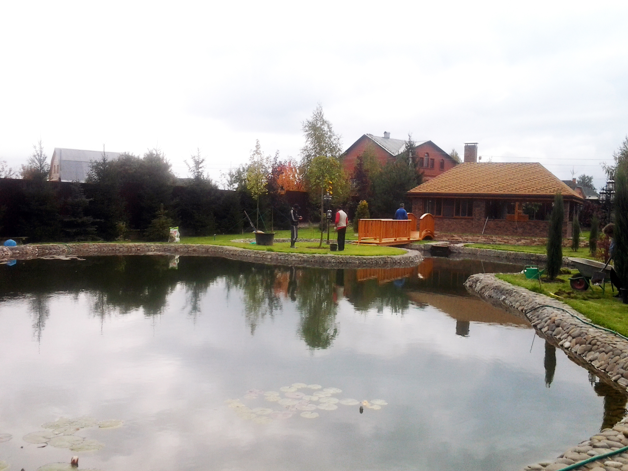 Хозяин поместья в Шишовке хотел иметь собственный пруд, точнее он уже был на территории участка, просто его необходимо было облагородить. Что мы и сделали. Пруд был вычищен от грязи. Вся набережная по периметру была уложена искусственным камнем, что обеспечило ей устойчивость от размытия водой.