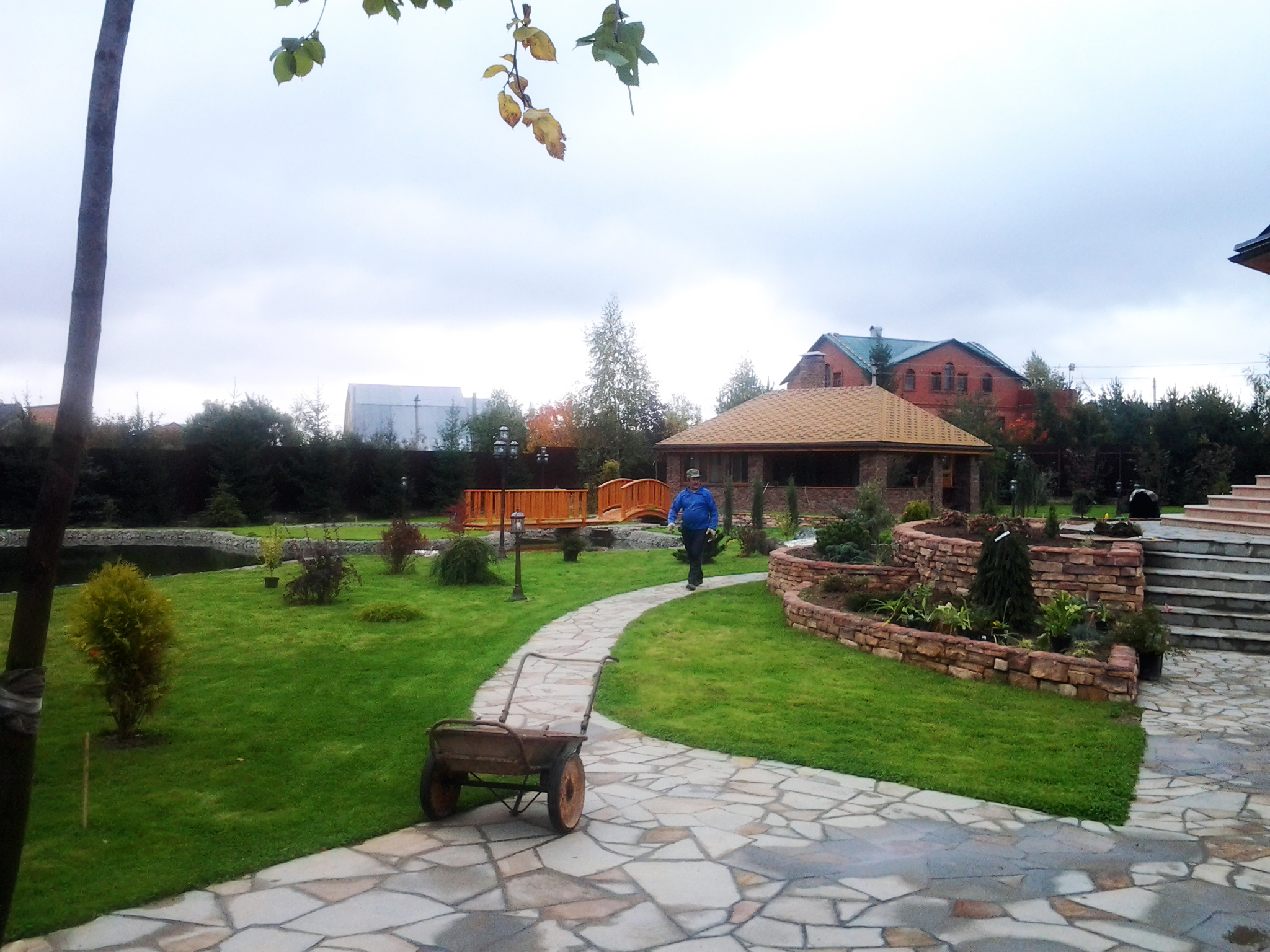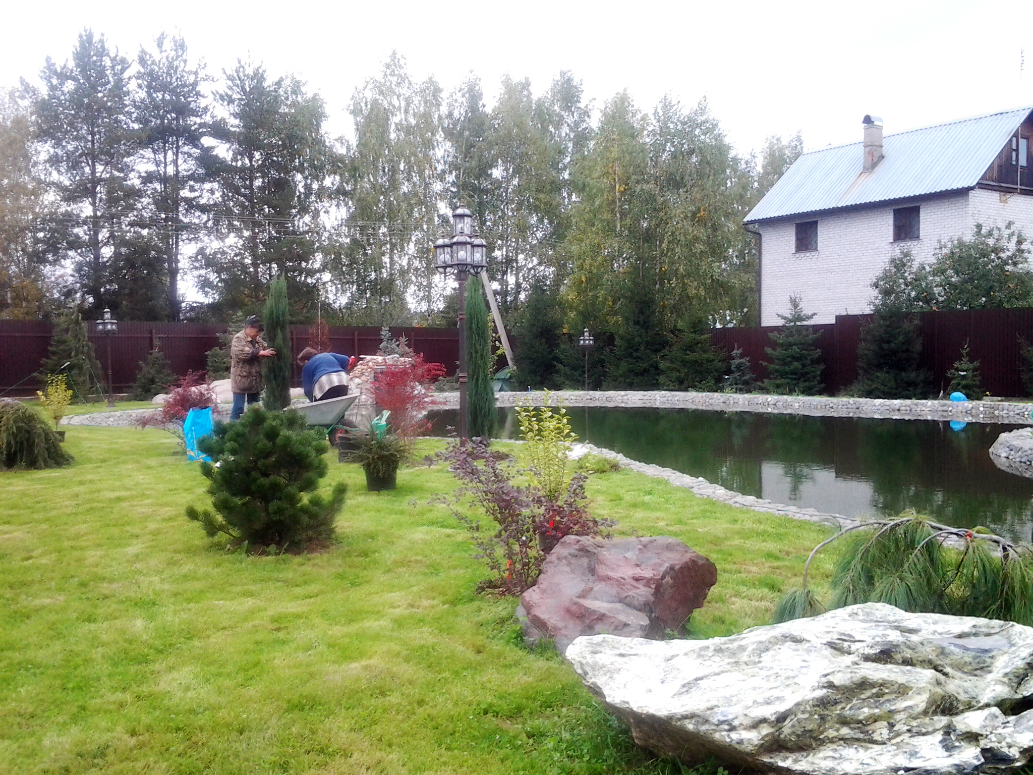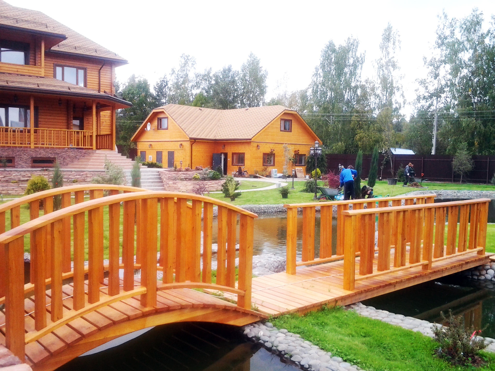 Хозяин поместья в Шишовке хотел иметь собственный пруд, точнее он уже был на территории участка, просто его необходимо было облагородить. Что мы и сделали. Пруд был вычищен от грязи. Вся набережная по периметру была уложена искусственным камнем, что обеспечило ей устойчивость от размытия водой.